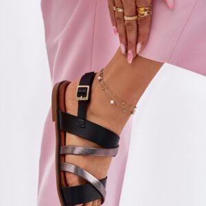 Stylowe sandały damskie z eko skóry to doskonały wybór na ciepłe dni. Wykonane ze skóry ekologicznej. Osadzone na płaskim obcasie zapewniają komfort i wygodę przez cały dzień. Z przodu znajdują się subtelnie przeplatające się paski, które dodają charakteru i lekkości. Sandały zapinane są na klamrę z regulowanym paskiem, co pozwala na idealne dopasowanie do stopy.