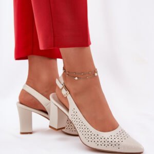 Sandały damskie wykonane z eko skóry, ozdobione ażurowym wzorem, to elegancki wybór na ciepłe dni. Szpiczaste noski subtelnie wysmuklają nogi, dodając im smukłości. Zapinane na sprzączkę z regulowanym paskiem, pozwalają na idealne dopasowanie do stopy. Obcas w formie słupka zapewnia stabilność, a całość łączy styl i wygodę, doskonale komponując się z letnimi sukienkami, spódnicami czy eleganckimi spodniami.