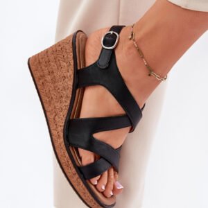 Damskie sandały wykonane z eko skóry to połączenie elegancji i komfortu. Osadzone na koturnie z imitacją plecionki. Przeplatające się paski z przodu nadają unikalnego charakteru, a zapinanie na sprzączkę umożliwia idealne dopasowanie do stopy. Skórzana, miękka wkładka gwarantuje wygodę przez cały dzień. Te sandały będą doskonałym wyborem na letnie dni, łącząc modny wygląd z funkcjonalnością.