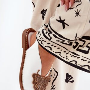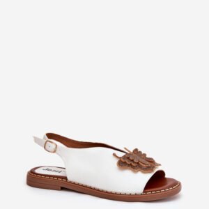 Damskie sandały od marki Jezzi, wykonane z wysokogatunkowej eko skóry. Ten model charakteryzuje się dekoracją z przodu, która dodaje im niepowtarzalnego charakteru. Osadzone na płaskim obcasie, zapewniają komfort dzięki miękkiej wkładce. Zapinane na regulowany pasek z klamrą. Idealne na różne uroczystości i wieczorne wyjścia, doskonale pasują zarówno do sukienek, jak i spodni, podkreślając kobiecą elegancję.