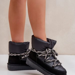 Damskie śniegowce wykonane z połączenia wysokiej jakości tkaniny syntetycznej i naturalnego zamszu. Osadzone na podeszwie z gumowego tworzywa. Prosty krój z syntetyczną podszewką zapewniającą doskonałe ciepło. Grube sznurowanie zapewni doskonałe dopasowanie do stopy. Koniecznie powinnaś je mieć w swojej zimowej garderobie!