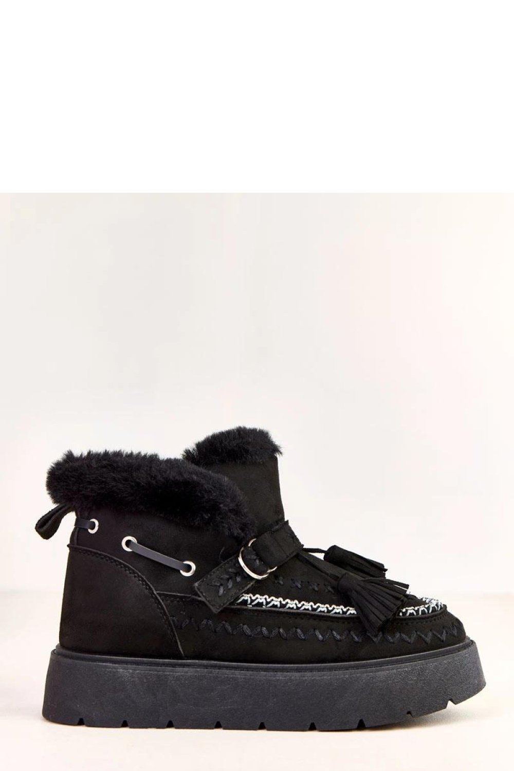 Śniegowce wsuwane z ozdobnymi frędzlami to połączenie wygody, ciepła i stylowego wyglądu idealne na zimowe dni. Wykonane z ekologicznej skóry zamszowej, prezentują się elegancko, a jednocześnie są odporne na codzienne użytkowanie. Model ma okrągły nosek i jest ocieplony futerkiem, dzięki czemu zapewnia komfort termiczny nawet w najchłodniejsze dni. Stylowe ozdobne frędzle dodają butom charakteru i lekkości, nadając im modny, casualowy wygląd. Platforma o wysokości 4 cm stabilizuje sylwetkę, a wkładka z futra syntetycznego gwarantuje dodatkowe ciepło i miękkość. Dzięki wsuwanej konstrukcji, buty są wygodne i szybkie w zakładaniu, idealne do codziennych, zimowych stylizacji.