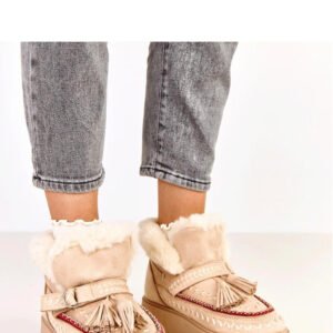 Śniegowce wsuwane z ozdobnymi frędzlami to połączenie wygody, ciepła i stylowego wyglądu idealne na zimowe dni. Wykonane z ekologicznej skóry zamszowej, prezentują się elegancko, a jednocześnie są odporne na codzienne użytkowanie. Model ma okrągły nosek i jest ocieplony futerkiem, dzięki czemu zapewnia komfort termiczny nawet w najchłodniejsze dni. Stylowe ozdobne frędzle dodają butom charakteru i lekkości, nadając im modny, casualowy wygląd. Platforma o wysokości 4 cm stabilizuje sylwetkę, a wkładka z futra syntetycznego gwarantuje dodatkowe ciepło i miękkość. Dzięki wsuwanej konstrukcji, buty są wygodne i szybkie w zakładaniu, idealne do codziennych, zimowych stylizacji.
