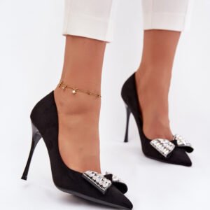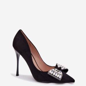 Szpilki damskie wykonane z eko zamszu to wyjątkowo elegancki model, który przyciąga wzrok subtelnymi detalami. Delikatna kokarda umieszczona na przodzie buta, ozdobiona błyszczącymi kryształkami, dodaje im biżuteryjnego uroku. Smukłe, szpiczaste noski podkreślają kobiecą linię stopy i nadają obuwiu klasycznego, szykownego charakteru. Idealne na wyjątkowe okazje, kiedy chcesz zaprezentować się stylowo i elegancko.