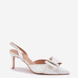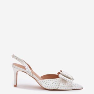 Zdobione szpilki damskie z odkrytą piętą to elegancka i stylowa propozycja na wyjątkowe okazje. Szpiczaste noski podkreślają smukłość sylwetki, a kokardka z przodu dodaje uroku i subtelności. Miękka wkładka zapewnia komfort przez cały dzień, łącząc wygodę z modnym wyglądem. Idealne na wieczorne wyjścia, wesela czy inne formalne uroczystości.