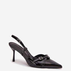 Czółenka damskie z odkrytą piętą, osadzone na szpilce, to doskonała propozycja na wyjątkowe okazje. Z przodu znajdują się dwa przeplatające się paseczki ozdobione małymi klamrami, które dodają im subtelnego uroku. Szpiczaste noski wydłużają nogi, nadając sylwetce smukłości i elegancji. Idealne na wieczorne wyjścia, wesela czy inne uroczystości.