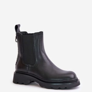 Wsuwane botki damskie wykonane z naturalnej skóry. Osadzone na płaskim obcasie. Noski zaokrąglone. Wnętrze ocieplane kocem obuwniczym. Model ten wyróżnia się ozdobnym łańcuchem z tyłu.