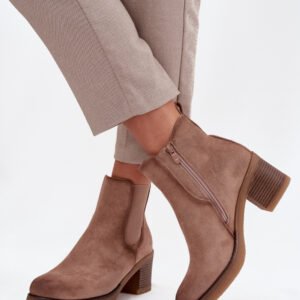 Botki damskie wykonane z eko zamszu. Osadzone na obcasie w formie słupka, który zapewnia stabilność i komfort przez cały dzień. Ocieplane, gwarantują ciepło w chłodniejsze dni, a zamek błyskawiczny ułatwia zakładanie. Z boku cholewki znajduje się subtelny, złoty detal, który dodaje im eleganckiego akcentu. Idealne do codziennych stylizacji, które wymagają zarówno wygody, jak i modnego wyglądu.