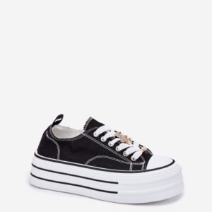 Trampki damskie z materiału tekstylnego osadzone na masywnej platformie to modna propozycja na co dzień. Sznurowane, z dodatkowymi złotymi przypinkami, które nadają im stylowego akcentu. Idealne do casualowych stylizacji, łączą wygodę z nowoczesnym wyglądem, świetnie pasując zarówno do spodni, jak i sukienek.
