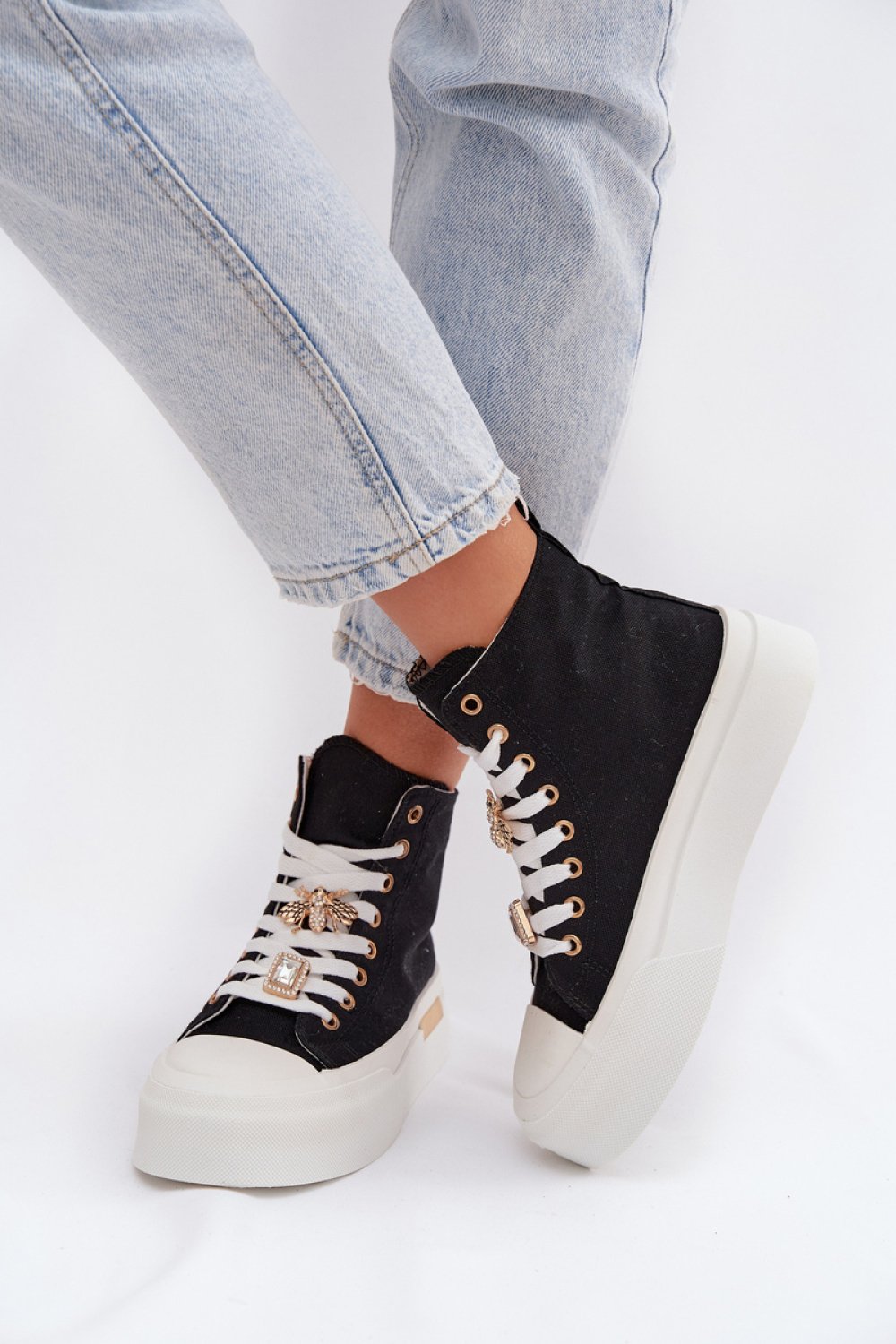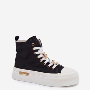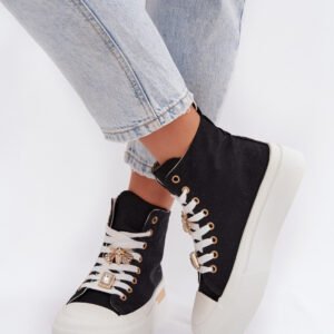 Trampki damskie na masywnej platformie to modna propozycja dla miłośniczek wyrazistego stylu. Gruba podeszwa nadaje obuwiu nowoczesnego charakteru i zapewnia komfort noszenia, a złoty element stanowi akcent przyciągający uwagę. Model sznurowany gwarantuje dobre dopasowanie do stopy, a ozdobne przypinki dodają całości oryginalności i modnego wyrazu. Trampki te doskonale sprawdzą się w codziennych stylizacjach.
