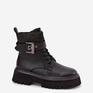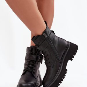 Botki workery damskie wykonane z naturalnej skóry. Model osadzony na platformie zapewnia stabilność oraz wygodę noszenia. Buty są sznurowane i zapinane na zamek, dzięki czemu doskonale dopasowują się do stopy i łatwo je zakładać. Wnętrze zostało ocieplone, co gwarantuje komfort i ciepło w chłodniejsze dni. Ozdobny pasek z klamrą nadaje im charakteru i modnego, lekko rockowego stylu. To doskonały wybór do codziennych stylizacji.