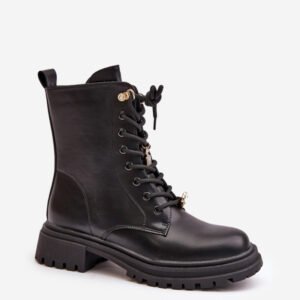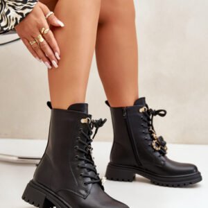 Damskie botki wykonane z ekologicznej skóry. Osadzone na płaskim obcasie. Noski zaokrąglone. Zapinane na suwak z boku dla łatwego zakładania, a dodatkowe sznurowanie z uroczymi przypinkami dodaje im wyjątkowego uroku. Idealne na jesienne i zimowe stylizacje, świetnie komponują się z różnymi zestawami na chłodniejsze dni.