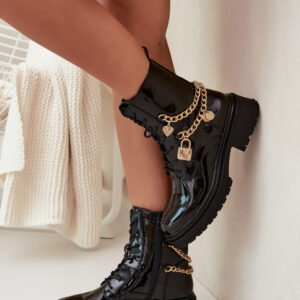 Stylowe botki damskie z eko skóry to doskonała propozycja na chłodniejsze dni. Ozdobione złotym łańcuchem z zawieszkami, które dodają modnego akcentu. Model zapinany na zamek i sznurowany umożliwia idealne dopasowanie do stopy. Środek ocieplony kocem obuwniczym gwarantuje ciepło i komfort, nawet w mroźne dni. Idealne na co dzień, te botki połączą funkcjonalność z modnym wyglądem, doskonale komponując się w różnych jesienno-zimowych stylizacjach.