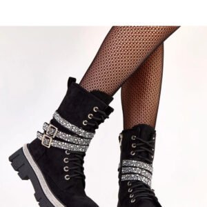 Stylowe i wygodne workery damskie wykonane z zamszowej skóry ekologicznej, które łączą modny design z funkcjonalnością. Ozdobne paski z cyrkoniami oraz sznurowanie nadają butom charakteru i eleganckiego, błyszczącego akcentu, idealnego do codziennych i miejskich stylizacji. Model o wysokości za kostkę i cholewce 18,5 cm zapewnia wygodne dopasowanie do stopy. Okrągły nosek oraz platforma z obcasem gwarantują stabilność i komfort podczas chodzenia, a ocieplenie sprawia, że buty doskonale sprawdzą się w chłodniejsze dni. Zamek boczny ułatwia zakładanie, a wkładka z tworzywa sztucznego zapewnia trwałość i wygodę noszenia. To idealny wybór dla kobiet, które cenią modny wygląd, wygodę i efektowne detale, które wyróżniają każdą stylizację.