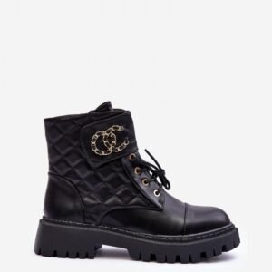 Botki damskie osadzone na płaski, stabilnym obcasie i platformie. Wykonane z eko skóry. Model zapinany na suwak oraz dodatkowo posiada sznurowanie. Na cholewce znajdują się przeszycia oraz gruby pasek z ozdobą. Zapiętek jest usztywniony, wnętrze ocieplone kocem obuwniczym. Świetny model do jesiennych i zimowych stylizacji!