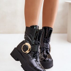 Wyjątkowe botki wykonane z naturalnej skóry. Osadzone na platformie i płaskim obcasie, zapewniają stabilność i wygodę noszenia. Model zapinany na zamek, dodatkowo posiada sznurowanie dla lepszego dopasowania. Duża klamra z paskiem na cholewce stanowi efektowny detal, który nadaje im modnego, wyrazistego charakteru.