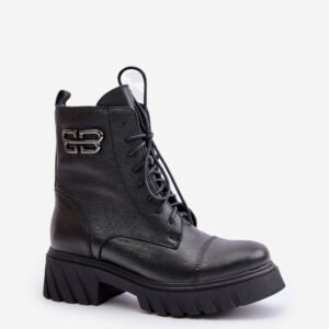 Botki damskie wykonane ze skóry naturalnej. Osadzone na masywnym, płaskim obcasie i platformie. Posiadają zarówno sznurowanie, jak i zamek, co zapewnia wygodę zakładania i dopasowanie do stopy. Z boku cholewki ozdobny, złoty detal, który dodaje elegancji. Wnętrze ocieplone kocem obuwniczym. Idealne do jesiennych i zimowych stylizacji, te botki łączą elegancję z funkcjonalnością.
