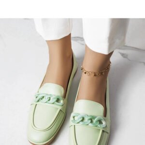 Zielone mokasyny zdobione łańcuchem Bobbie to idealny wybór dla kobiet, które cenią sobie elegancję i wygodę. Te stylowe mokasyny wykonane są z wysokiej jakości skóry ekologicznej, co gwarantuje trwałość i estetyczny wygląd. Prosty krój cholewki został urozmaicony grubym łańcuszkiem, który dodaje całości szyku i elegancji. Dzięki uniwersalnemu kolorowi, te mokasyny pasują do wielu stylizacji, a wsuwane zapięcie sprawia, że są wygodne w noszeniu. Doskonałe na nadchodzące lato!