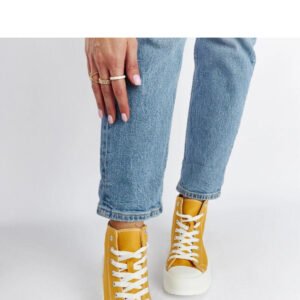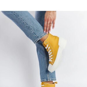 Żółte trampki za kostkę Ronchis to doskonała propozycja dla osób poszukujących wygodnego, modnego i trwałego obuwia. Wykonane z wysokiej jakości gumy, zapewniają trwałość i odporność na różne warunki atmosferyczne. Sznurowane zamknięcie pozwala na idealne dopasowanie do stopy, co sprawia, że są one wygodne w noszeniu. Żółty kolor dodaje trampkom oryginalności i trendowego charakteru, co pozwala wyróżnić się ze swoim stylem. Idealne na letnie dni, te trampki na średnim obcasie są dostępne w przystępnej cenie, co czyni je atrakcyjnym wyborem dla wszystkich modnych kobiet. Oferują wygodę, styl i trendy design – bez wątpienia będą doskonałym uzupełnieniem letniej garderoby.